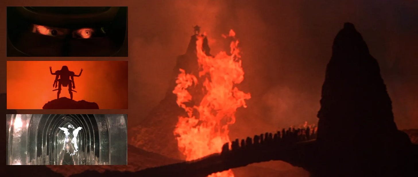His results are fair enough, because he couldn’t possibly have guessed. Nelson’s ultimate resolution — if it’s supposed to be what’s really happening, as opposed to a just a death fugue in Reinhardt’s mind — lurches clumsily from the scientific to the metaphysical. As the Sygnus drifts inexorably into the black hole, Reinhardt is crushed beneath a giant falling screen as the bridge of his ship crumples around him. And suddenly we’re in Hell. Reinhardt, floating weightless in cloudy red space, is apparently fused with Maximilian, his panicked eyes looking out through the robot’s eye slit. We then see Maximilian in silhouette against a red sky, standing on a rocky outcrop in the middle of a flaming landscape. Reinhardt’s robed zombots shuffle, monk-like, heads bowed, across a stone bridge. A glittering stained glass window appears, which then becomes an arched, glass corridor, down which a white-glowing, long-haired, robed figure, spectrally transparent, flies at some speed towards the light at the end.