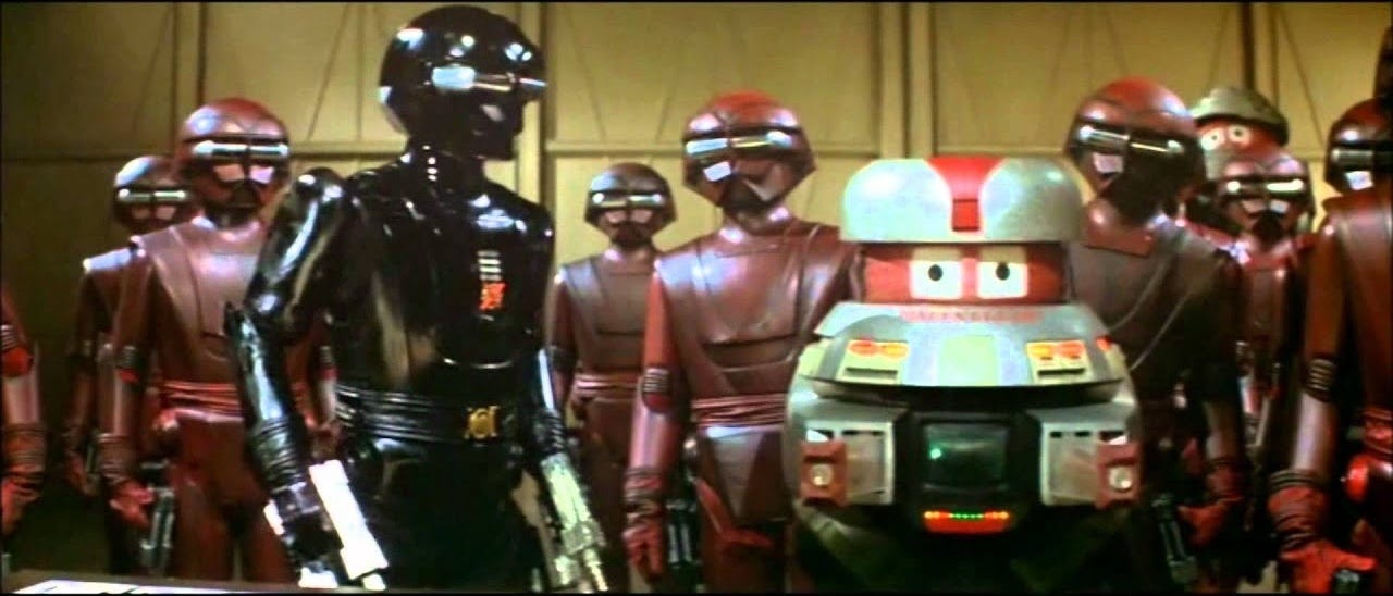 The Black Hole was Disney’s 1979 attempt to surf the wave of sci-fi knock-offs that arrived in the wake of Star Wars. A loose riff on Jules Verne’s Twenty-Thousand Leagues Under the Sea, the story involves some explorers aboard the space-crate Palomino stumbling upon a mad scientist living alone at the edge of the titular void, on a ship (the Cygnus) run by faceless automatons. He claims his crew deserted him before he could embark on a whacky experimental attempt to navigate inside the black hole, but it turns out he’s lying, and the “robots” are the zombie-cyborg remains of his shipmates.